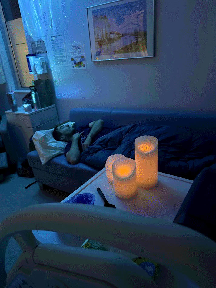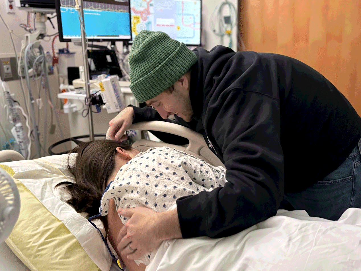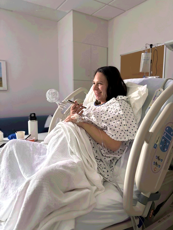 After the procedure Dad and Danielle return to the room, and Mom is feeling great!! She feels zero pain and can't believe she's still having contractions! And she can move her legs. She is totally elated. She tells the nurses "Welcome to my party!" when they enter the room. When Mom notices that her IV drip says fentanyl, she is surprised since fentanyl is a drug that's commonly in the news for recreationally killing people. She invites Grandma for a visit in the delivery room and facetimes Sofia. The bone broth at the hospital tastes so good, but Mom wants some real food! Danielle says it's ok to sneak in some food, so Dad brings Mom a grilled cheese sandwich from the pub next door. Mom also eats two of Grandma's healthy muffins.