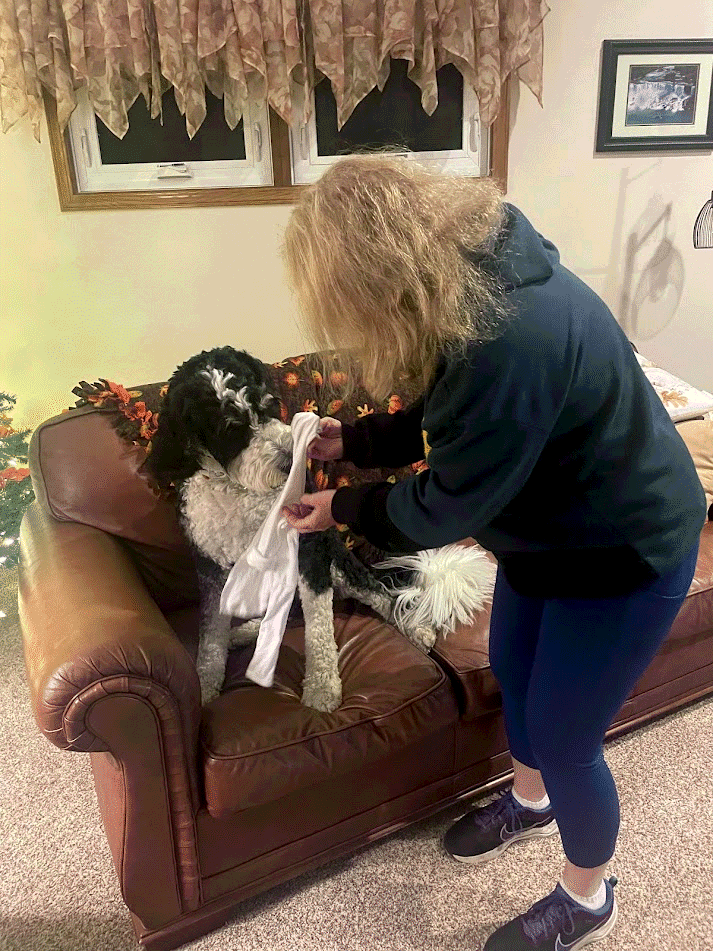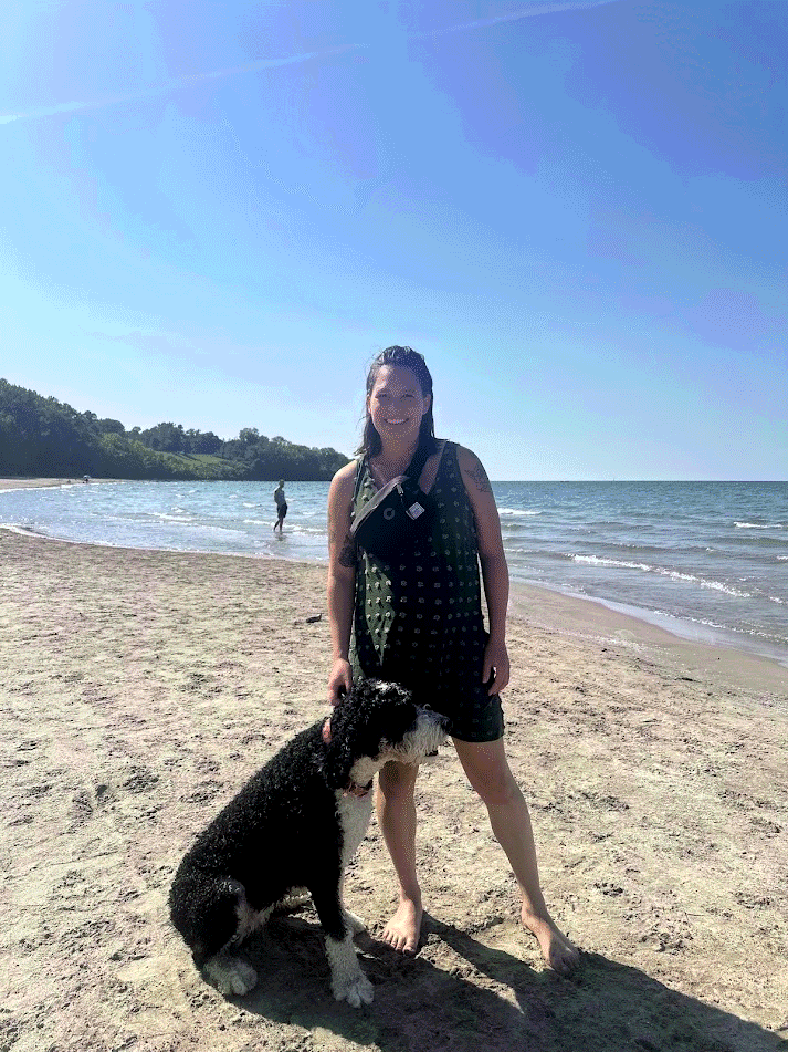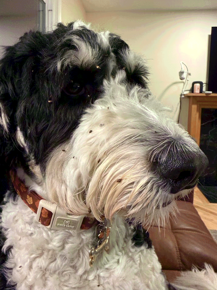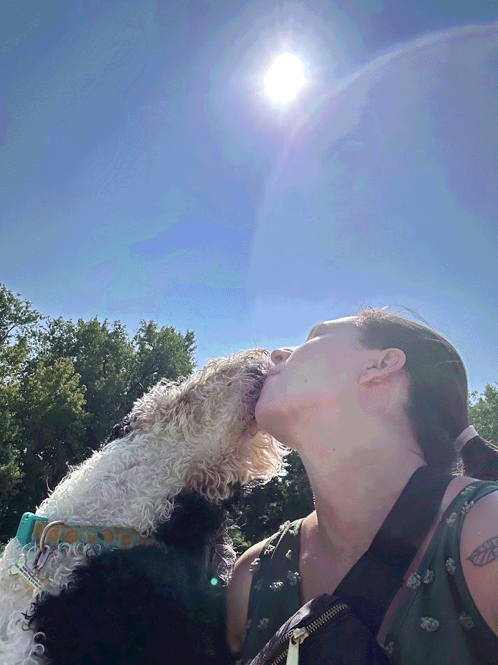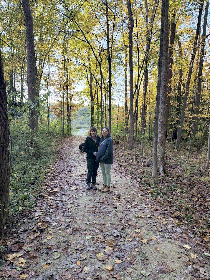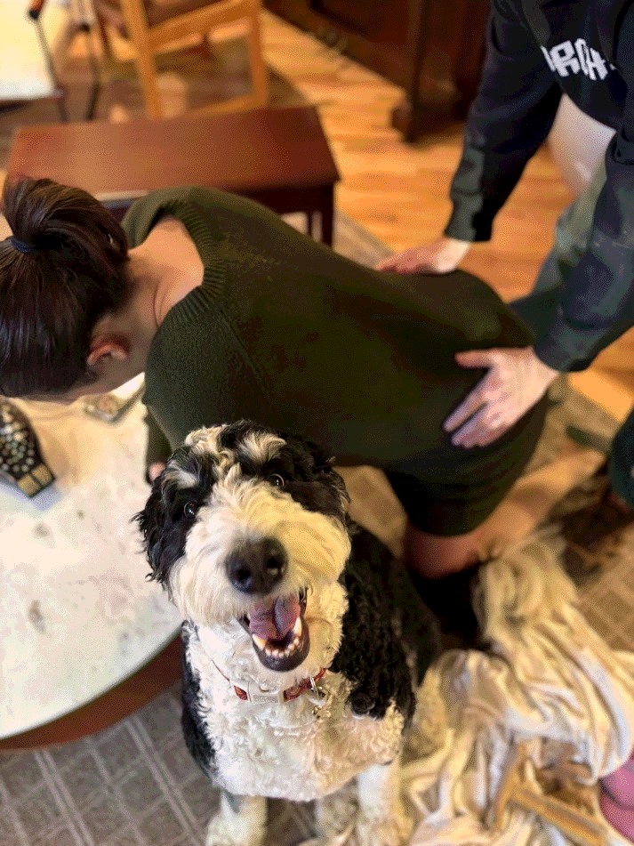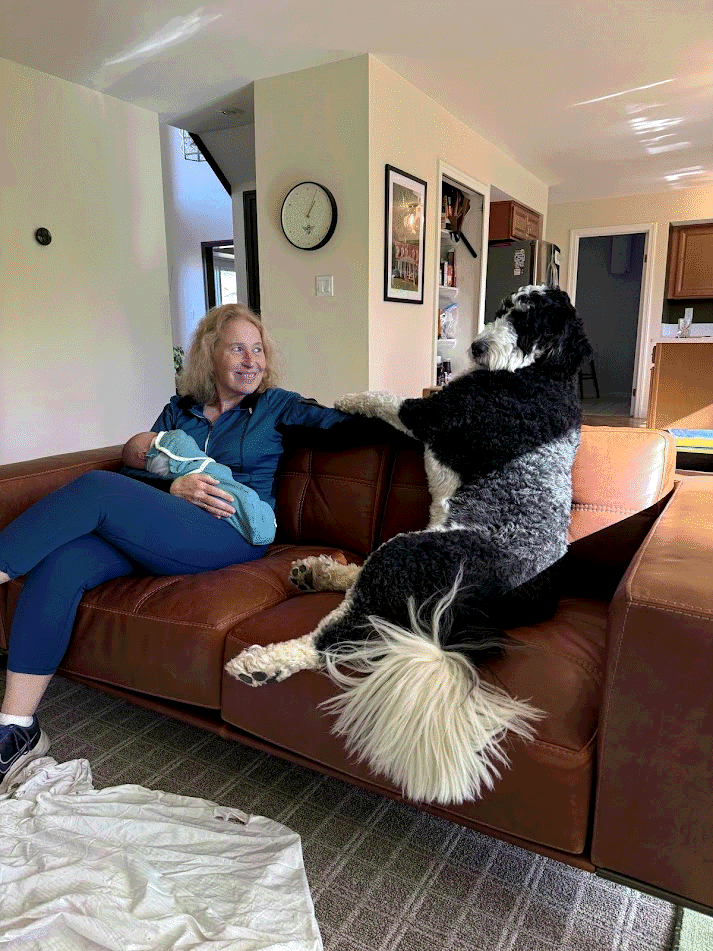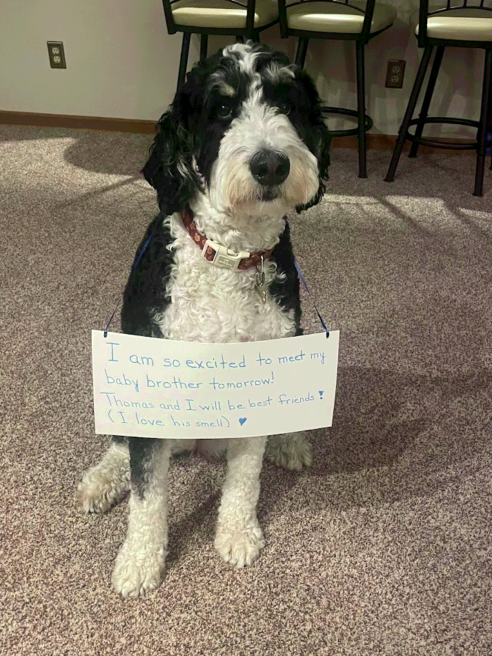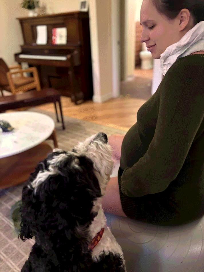 Thomas shifts position, so Mom feels very comfortable! Her back doesn't hurt anymore and Thomas isn't pushing down anymore! She starts hiking 3 miles most days with Grandma at North Chagrin Reservation. Lola gets covered in lots of seeds that Mom has to pick out after each hike.
