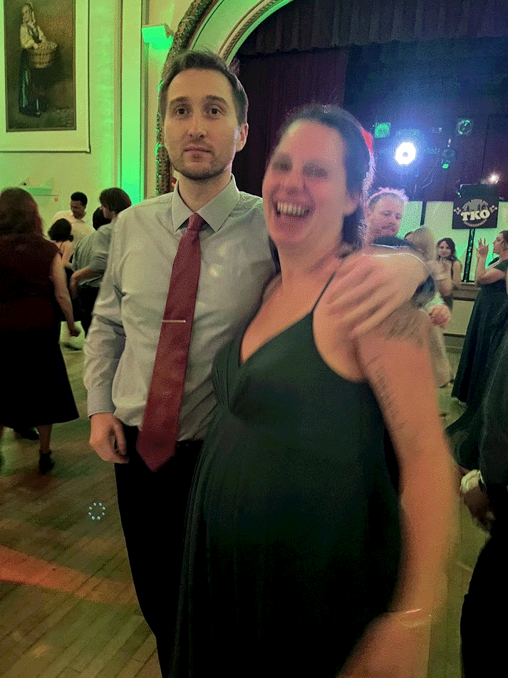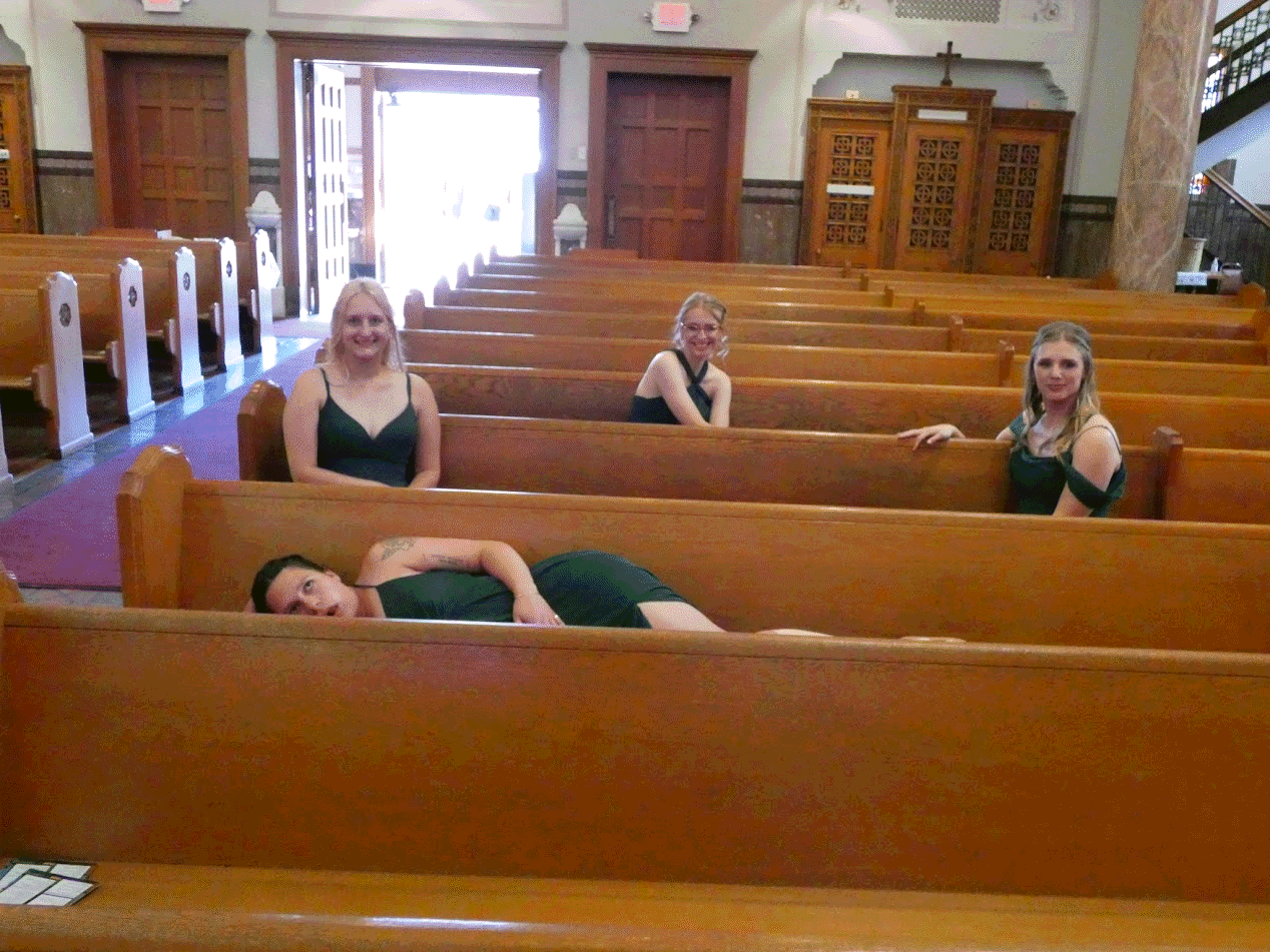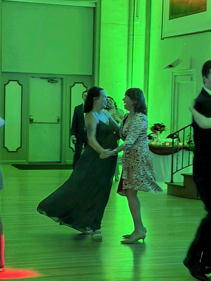 It's Carolyn and Thomas Martin's wedding! Mom is a bridesmaid. After the hot service at the church she boards a party bus tired and hungry. Unfortunately there are only sub sandwiches on the bus, and Mom isn't supposed to eat those since she's pregnant! Dad saves the day by bringing her a double cheeseburger and fries while the bridal party is taking photos at the art museum. Everyone swears Thomas will be born the next day since Mom is so pregnant she can barely walk. And she polka'd way too hard!