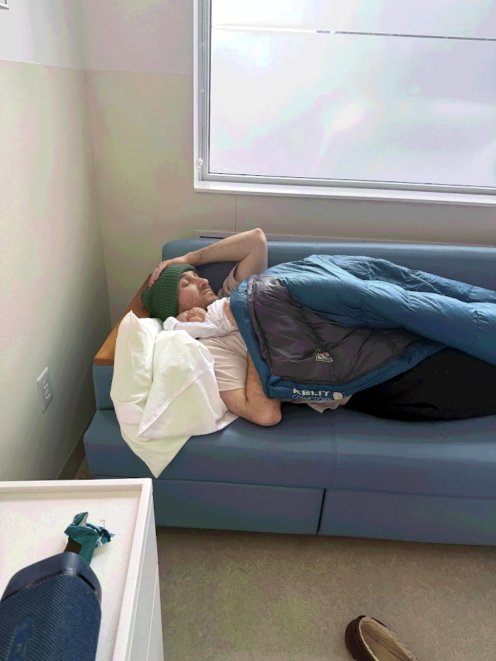 At 9pm Mom is given pitocin. Labor begins progressing slowly, so it seems like Thomas won't be a Halloween baby! At midnight mom calls for her midwife since she feels pressure. Mom measures 8cm dilated, 0 station, and 90% effaced. Mom gets some sleep so she'll have energy to push the next day. Dad has a great sleep setup with his sleeping bag on the couch.