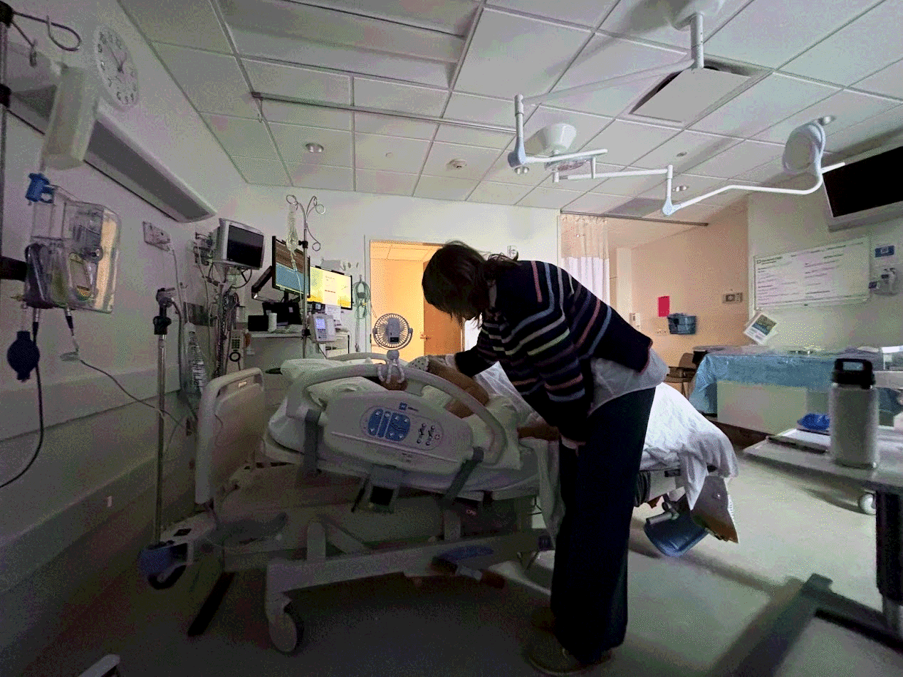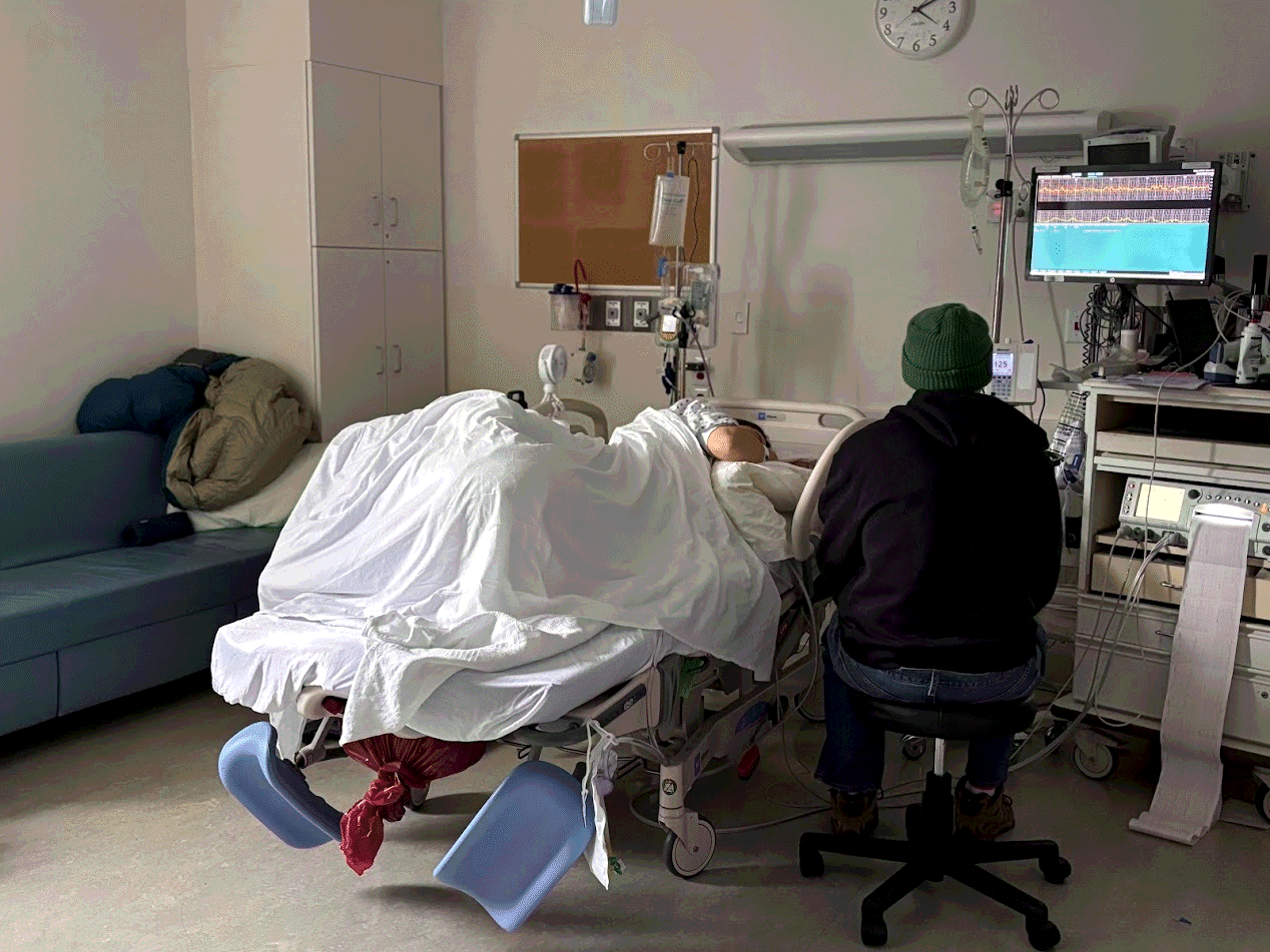 Mom and Dad expect to be greeted by professionals upon arrival at the hospital but there's just a lady at a desk! Dad asks for a wheelchair for Mom who is completely disassociating at this point and making lots of noise. Dad makes a phone call on a red wall mounted telephone in a separate room to tell Labor and Delivery that they are ready to come up! Mom and Dad think this is a silly system. When Mom is being checked in at Labor and Delivery, she cannot answer any of the questions because she's in too much pain to focus on anything but her labor. Her body is shaking and sweating ferociously nonstop. Mom is 5cm dilated, -2 station, and 90% effaced.