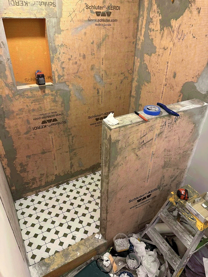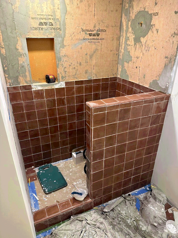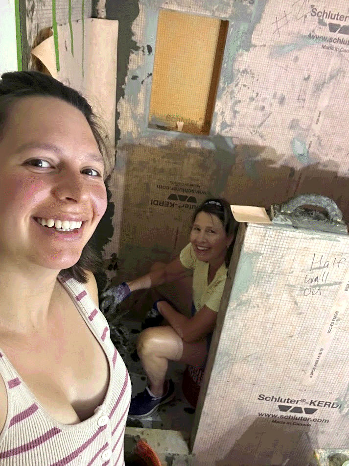 Mom and Grandma work on the tiling project! They are quite the duo - a pregnant lady and a 60 year old. They have lots of fun doing it and feel very capable.