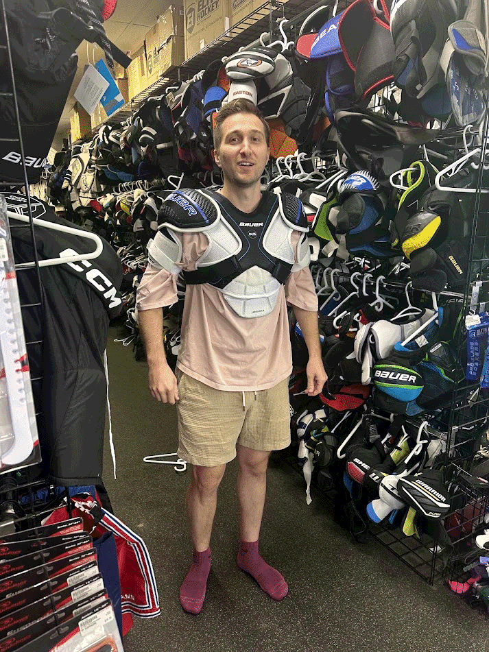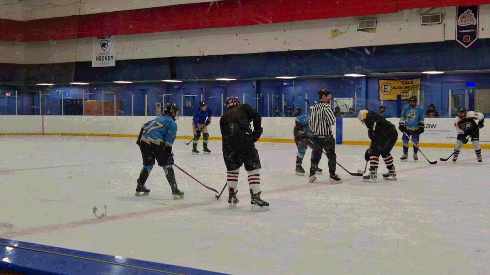 Dad has his first day in the Euclid Senior Hockey League. He joins the Black team and Teta Skin is on the Blue Team (the Jacks). Dad tries hard to learn the rules and the positions, but it turns out there are no rules and not even any goalies for the game! They play with nets inside of nets instead of having goalies. Dad is falling everywhere. Everyone thinks Dad is not a great skater, but Mom knows better! It turns out that brand new skates don't come sharpened. Dad was skating without any edges! Everyone is surprised Thomas isn't born yet.